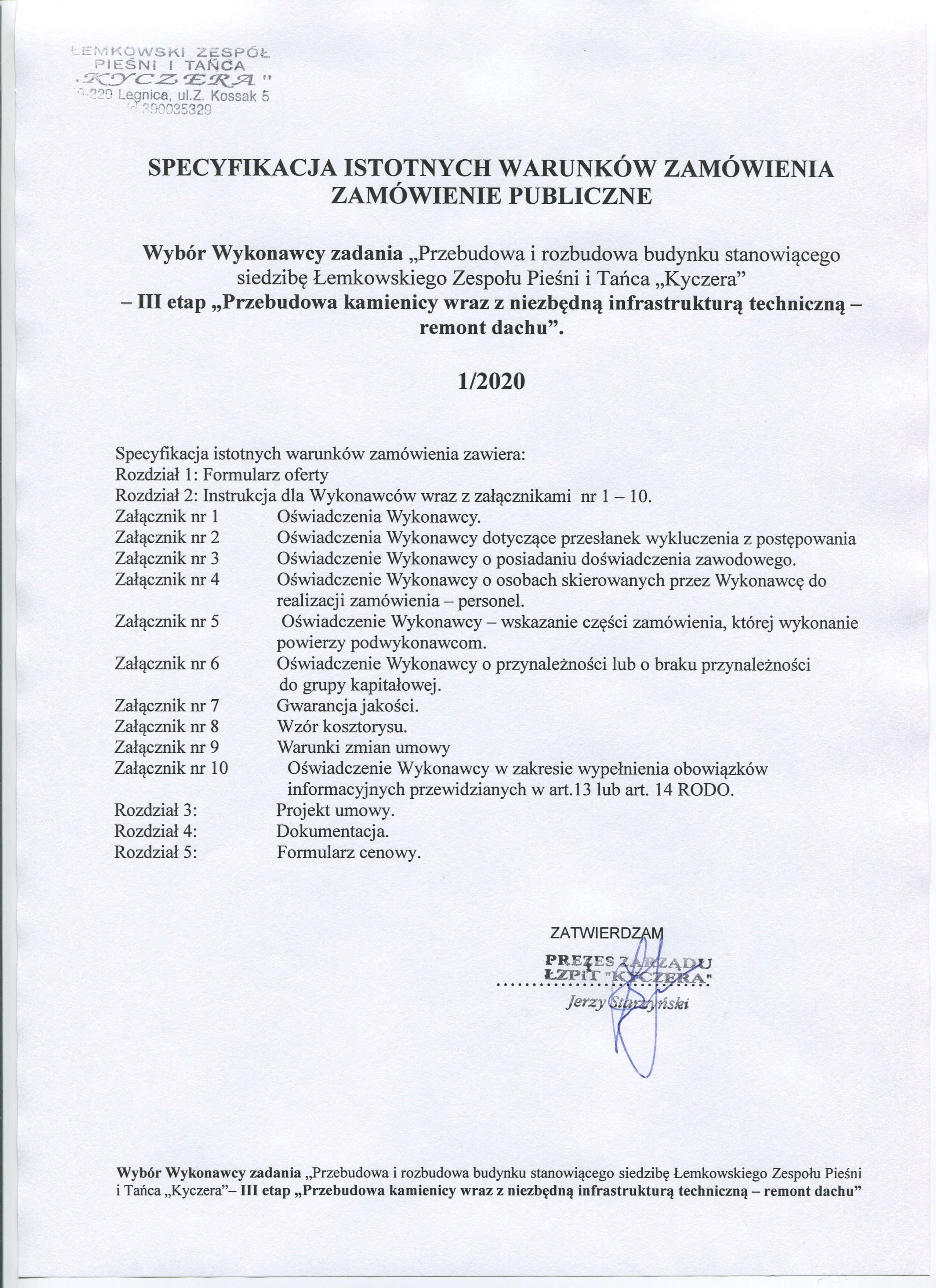Przedmiot zamówienia: Wybór Wykonawcy zadania „Przebudowa i rozbudowa budynku stanowiącego siedzibę Łemkowskiego Zespołu Pieśni i Tańca „Kyczera”– III etap „Przebudowa kamienicy wraz z niezbędną infrastrukturą techniczną – remont dachu”.