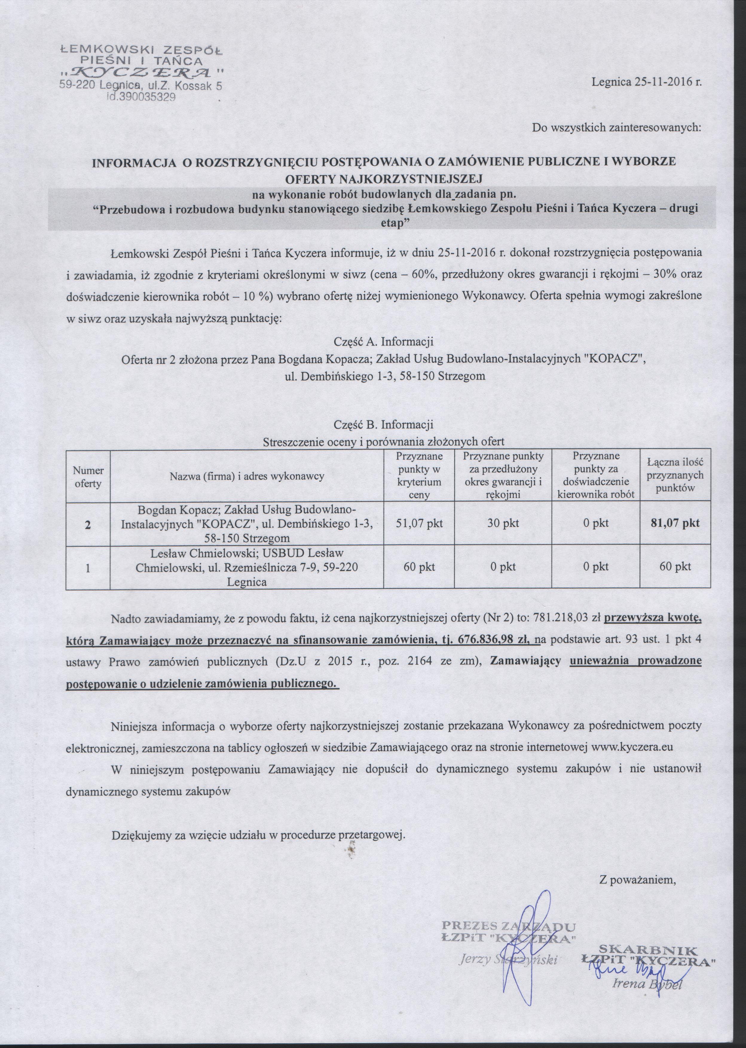 Rozstrzygnięcie postępowania z dnia 25.11.2016