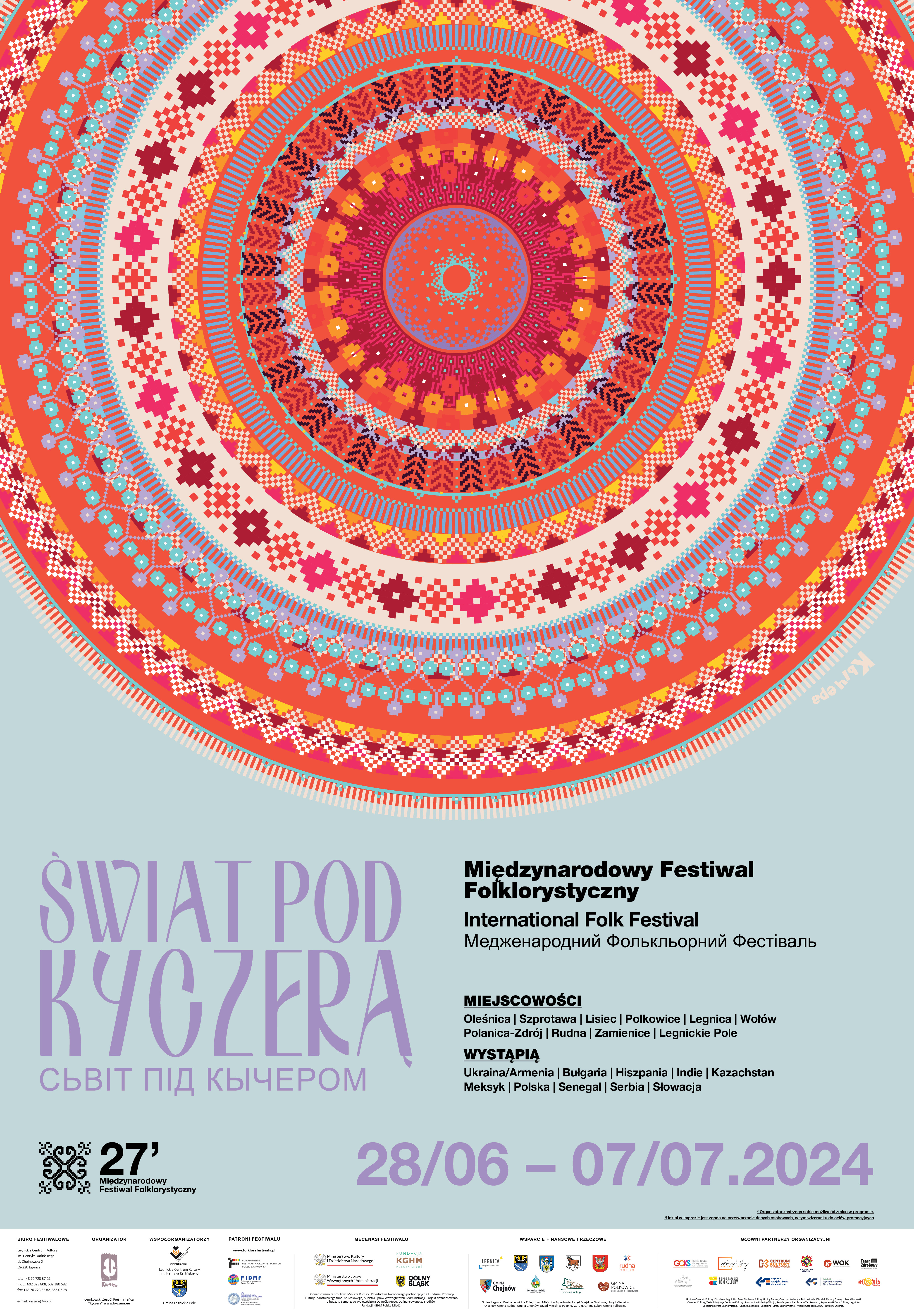 W tegorocznej edycji wzięły udział zespoły z aż 9 krajów: Armenia/Ukraina, Hiszpania, Polska, Meksyk, Serbia, Słowacja, Senegal, Indie i Bułgaria, które zachwyciły publiczność swoimi występami podczas 15 koncertów, w tym 4 szczególnie bliskich naszym sercom. Koncerty te odbyły się w Domach Pomocy Społecznej w Legnicy, Chojnowie i Mierczycach – pozwalały one pokazać kulturę innych krajów tym, którzy sami nie mogli dotrzeć na nasze wydarzenia. Festiwalowa trasa objęła 10 miejscowości: Legnicę, Legnickie Pole, Oleśnicę, Szprotawę, Polanicę-Zdrój, Rudną, Lisiec, Zamienice, Polkowice i Wołów, a w ramach festiwalu blisko 15 000 osób obejrzało występy i wzięło udział w licznych aktywnościach, ciesząc się pięknem folkloru i różnorodnością tradycji. Ogromne wsparcie zapewniła nam grupa wolontariuszy, która z zaangażowaniem opiekowała się zespołami, dbając o to, by czuli się u nas jak najlepiej. Wydarzenie cieszyło się również ogromnym zainteresowaniem w sieci, co pokazało, że folklor potrafi jednoczyć ludzi nie tylko na żywo, ale i online. Nie zabrakło również mnóstwa atrakcji, niezapomnianych emocji i wspaniałych gości, którzy współtworzyli tę wyjątkową atmosferę. Każda edycja festiwalu jest dla nas niezwykle ważnym wydarzeniem, dlatego wkładamy w niego całe swoje serca. Nasze starania zostały dostrzeżone – FIDAF (Federation of International Dance Festivals)już drugi rok z rzędu przyznał nam nagrodę dla jednego z najlepszych festiwali na świecie, tym razem za rok 2023! Dziękujemy wszystkim, którzy byli częścią tego wydarzenia – to właśnie dzięki Wam nasz festiwal jest tak wyjątkowy!