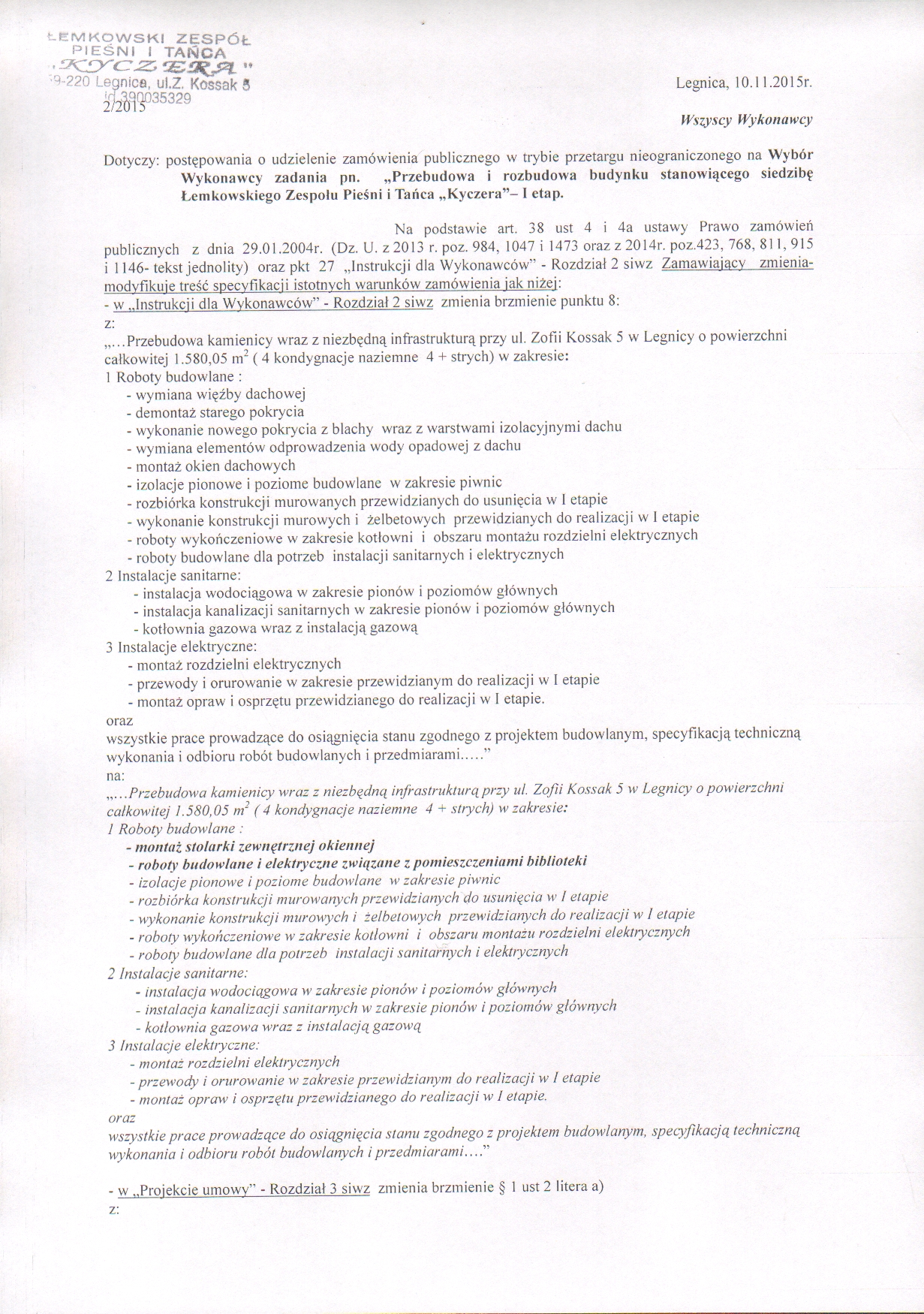 Ogłoszenie o zmianie ogłoszenia z dnia 10.11.2015